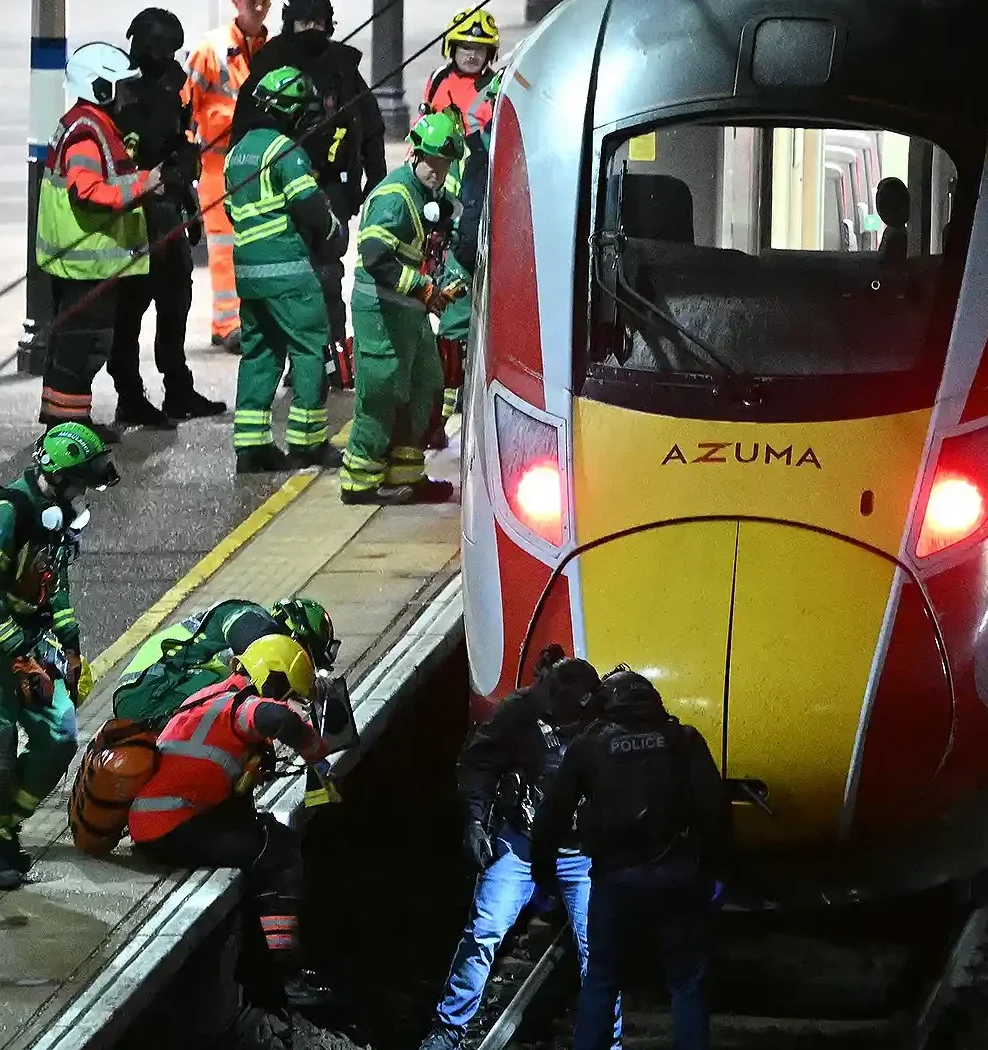 TOPSHOT - Police officers and members of the Emergency services search the track beneath an LNER Azuma train at Huntingdon Station in Huntingdon, eastern England, on November 1, 2025, following a stabbing on a train. UK police said they had arrested two suspects Saturday as "a number of people" were taken to hospital after a stabbing on a train in Cambridgeshire, eastern England. "We are currently responding to an incident on a train to Huntingdon where multiple people have been stabbed," British Transport Police said on X, adding that "two people have been arrested".